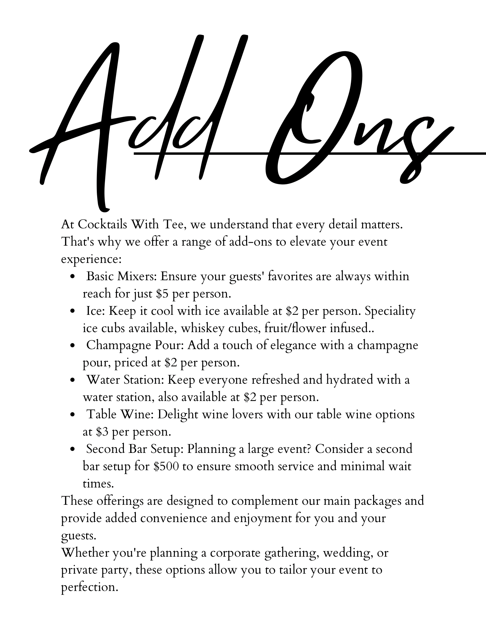 Our luxury mobile bar service provides seamless handling of large-scale events. We offer comprehensive beverage solutions specifically designed for major events and large weddings. Starts at $250 a hour. 3 hour minimum.